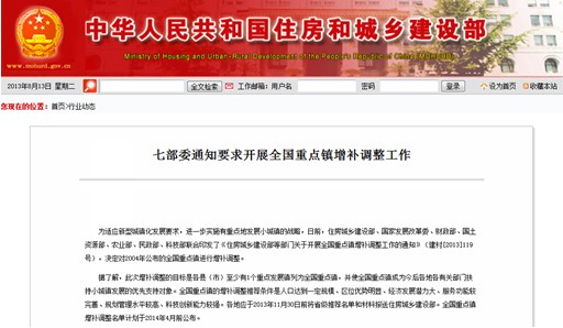 据国家住房和城乡建设部消息,日前,住房城乡建设部、国家发展改革委、财政部、国土资源部、农业部、民政部、科技部等七部委联合印发《住房城乡建设部等部门关于开展全国重点镇增补调整工作的通知》(建村[2013]119号),决定对2004年公布的全国重点镇进行增补调整。