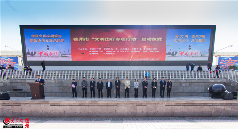 大众网德州4月28日讯(记者 庄滨滨 撒伟 董天力)为强化广大市民的文明出行意识,提高市民的文明水平,自觉做到说文明话,办文明事,做文明人,动员全市上下积极参与到创建全国文明城市的行动中来,4月28日,德州市“文明出行专项行动”启动。德州市市领导景文新、陈璞平、崔书强等出席启动仪式。