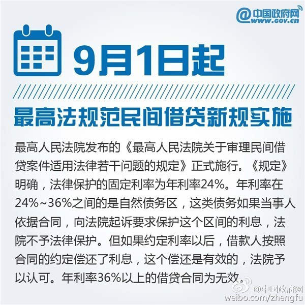 9月1日起,最高人民法院发布的《最高人民法院关于审理民间借贷案件适用法律若干问题的规定》正式施行。用年利率24%和36%这两个关键数字,重新划定了民间借贷的利率和利息问题。